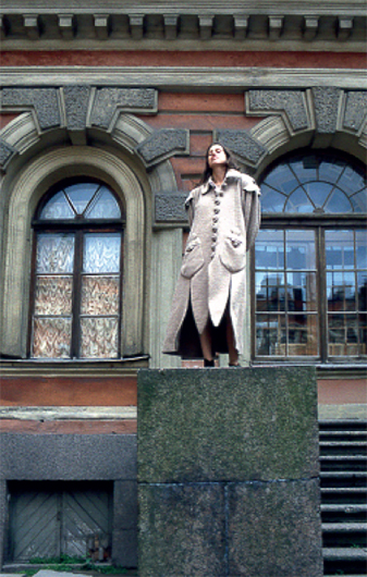 © «Искусство — XXI век» Е. Андреева в пальто К. Гончарова. 1994Фото И. Мовсесяна Сидя в самолете, я трогаю полы гончаровской юбки и восстанавливаю покой в себе, выстраиваю себя после суеты таможни и унылости паспортного контроля, и мой мир показывает мне нежное внутреннее кино, утешает мысленный взор, как ветвь, полная цветов и листьев.