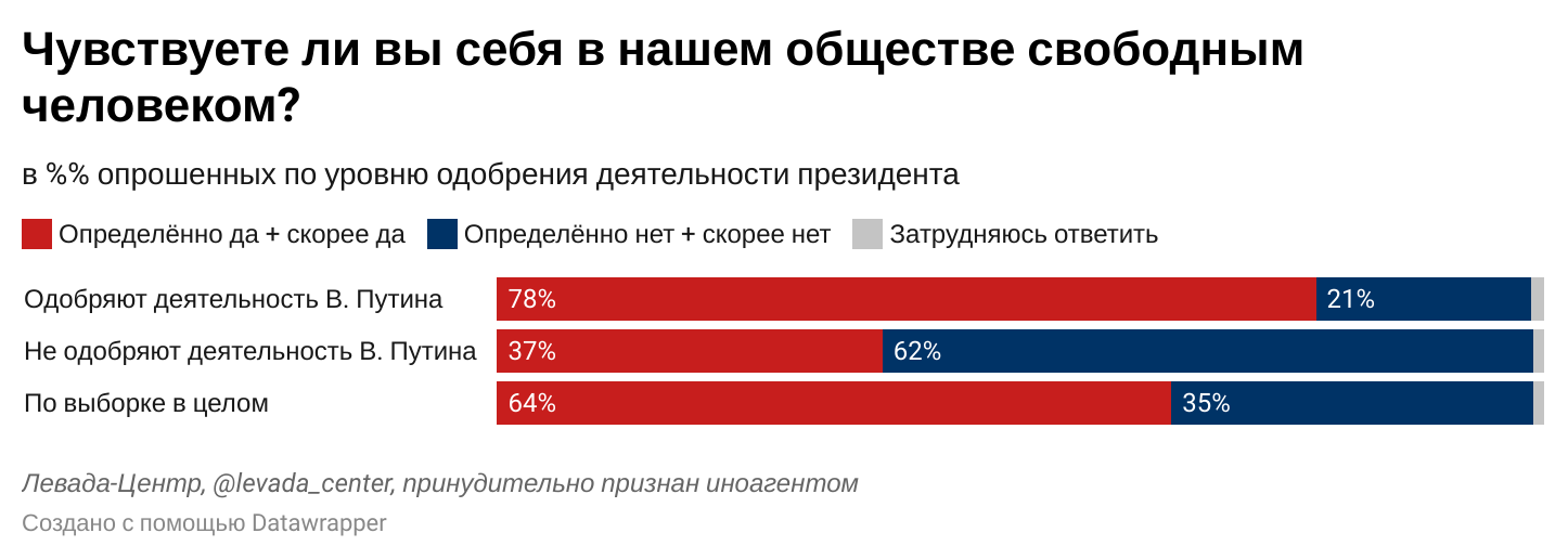 – Но мы все же видим, что в последние годы, скажем так, в последние два десятилетия, настроения у людей меняются. То есть их по-прежнему волнует положение дел в стране, мы видим – по тем индикаторам, которые отслеживает "Левада-центр", – что растет и падает одобрение президента, и даже видим, что власть реагирует на эти изменения. В некоторых опросах 2011–2013 годов примерно 40% респондентов отвечали, что считают направление развития страны правильным, и столько же – неправильным. В эти же годы одобрение деятельности президента было минимальным (опускалось до 60%), а неодобрение – максимальным (приближалось к 40%). После этого мы получили аннексию Крыма. Потом этот эффект постепенно прошел и в начале 2019 года, а также в апреле 2020 года, мы снова видим сближение этих позиций. Значит ли это, что следует ожидать новых резких движений от власти – во внутренней или внешней политике?