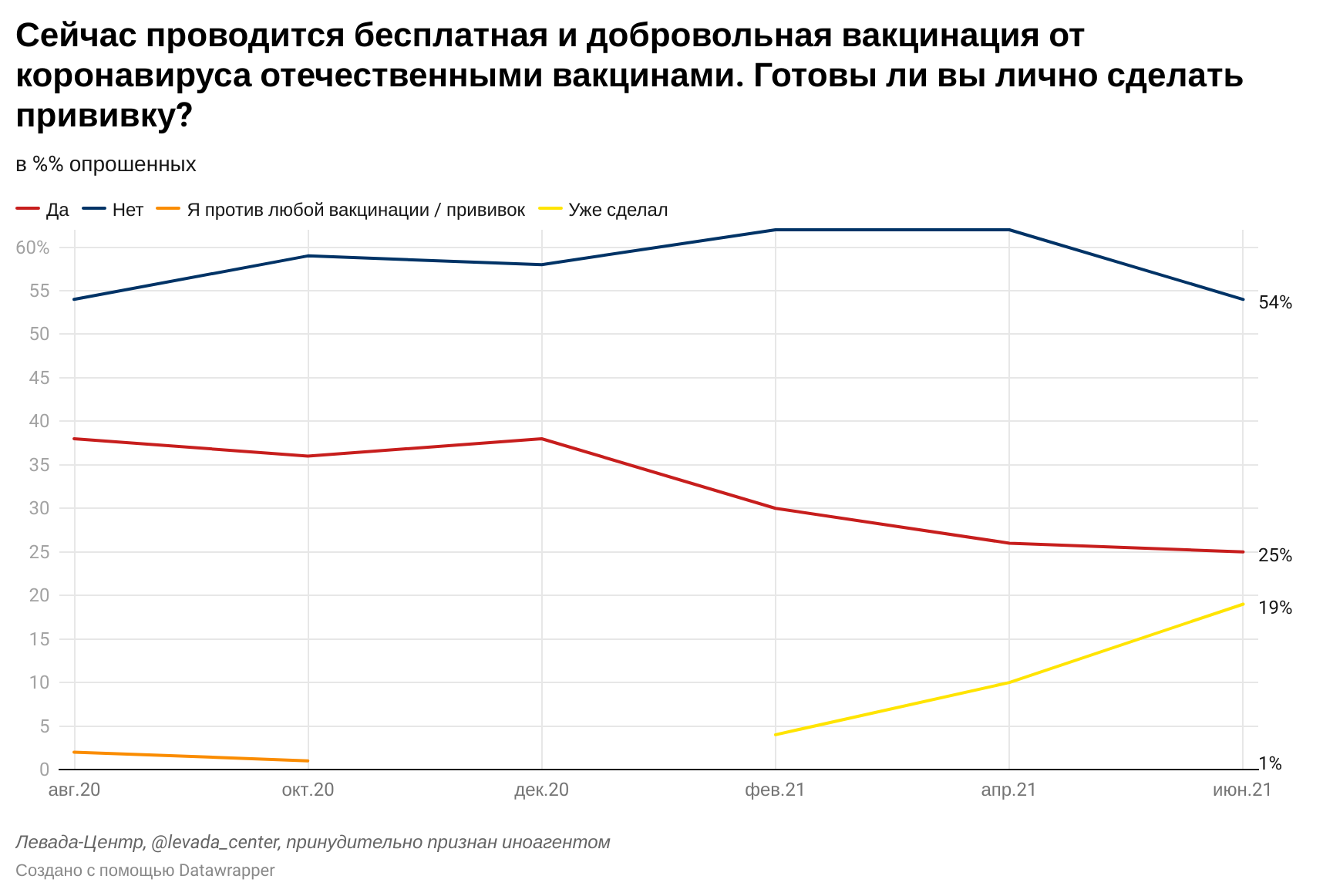 – Одной из наиболее актуальных тем в последнее время стала проблема с вакцинацией в России. Данные последнего вашего опроса говорят о том, что россияне по-прежнему, несмотря на все усилия госпропаганды, не хотят прививаться. Как вы это объясняете?