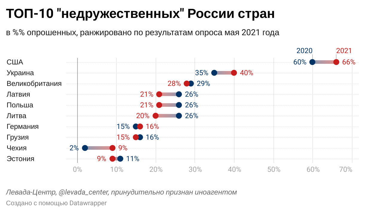 – Да, 83% респондентов – и это рекордное число, сравнимое только с посткрымским периодом – уверены, что "кругом враги". Это, конечно, враги не только внешние – Запад вообще или отдельные страны, но и внутренние враги. Россия видится осажденной крепостью, а власть – защитницей людей от врагов. На этом и держится то, что примерно две трети россиян поддерживают режим.