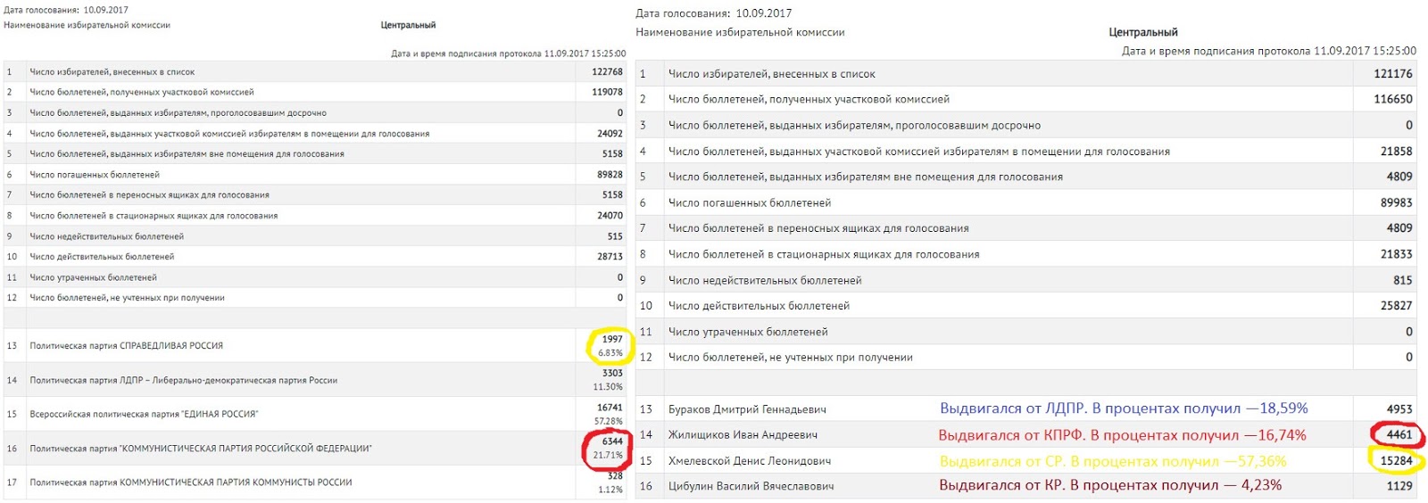 Примечательно, что в этом самом округе якобы только 6,83% или 1997 избирателя по партийным спискам проголосовали за «Справедливую Россию», которую в крае возглавляет Хмелевской. В тоже время КПРФ во главе с Жилищиковым поддержали 21,71% или 6344 избирателя. И это самый высокий результат для КПРФ среди всех 35 округов!