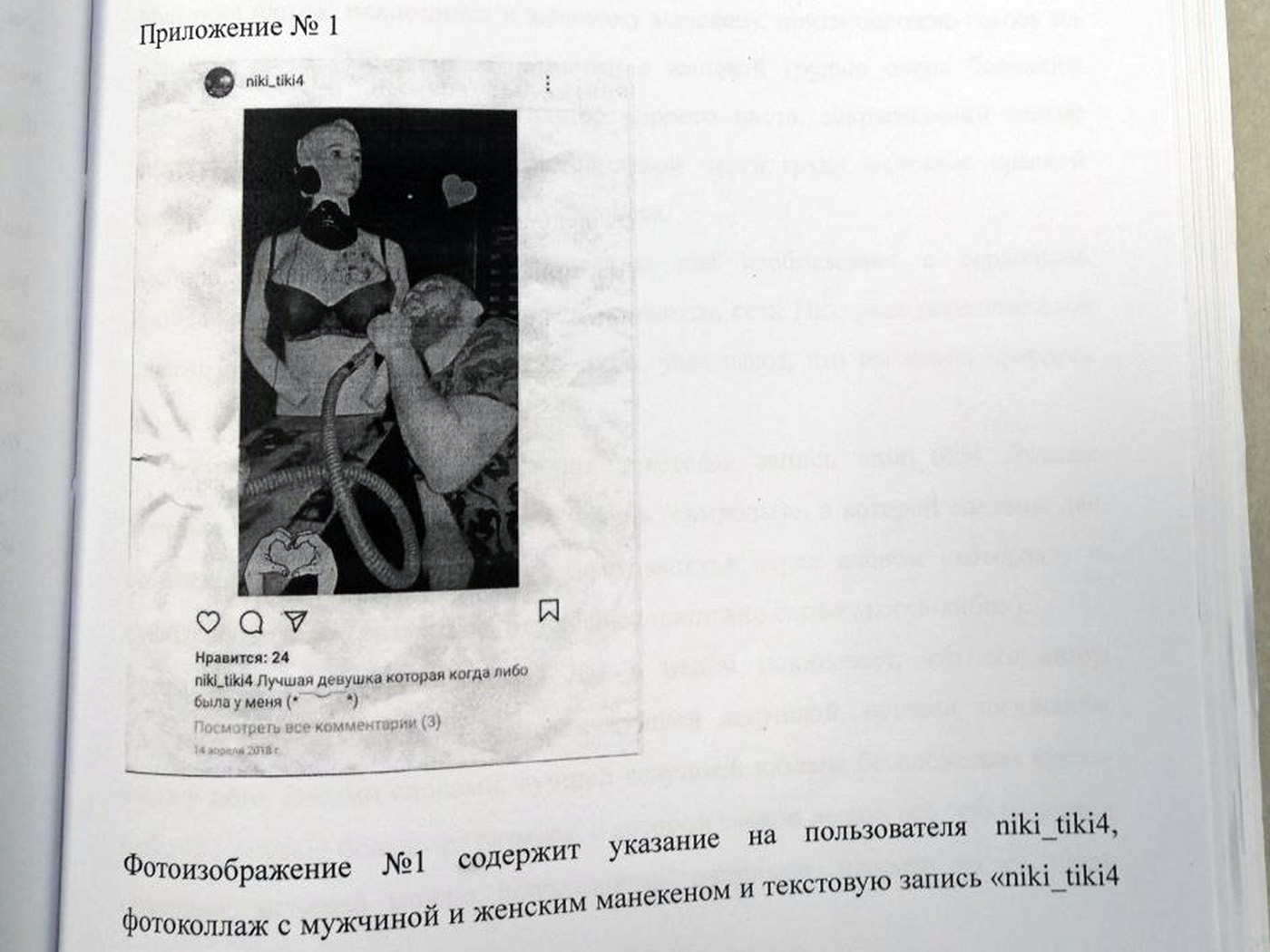 — На переднем плане фотоколлажа представлен бородатый мужчина, который занимается курением кальяна, — описывает Мальцева фотографию Тушканова с женским манекеном. — Обращает на себя внимание запись «Лучшая девушка, которая когда-либо была у меня». <…> Иными словами, лучшей девушкой была названа бессловесная кукла-рабыня с грудью большого размера, с которой можно делать все, что мужчина пожелает.