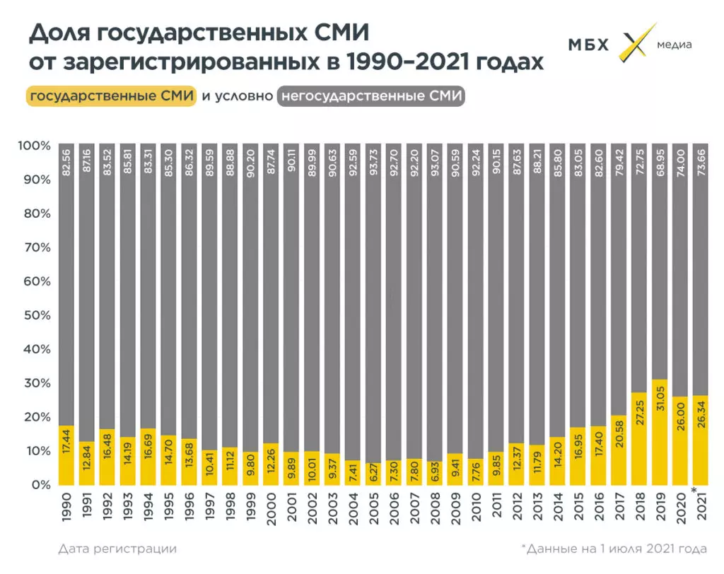 Рыночные правила, однако, не действуют для СМИ, финансируемых из государственного или регионального бюджетов. Поэтому доля государственных среди всех зарегистрированных СМИ растет с каждым годом — и финансовые кризисы этому не помеха. Например, из 3700 изданий, получивших регистрацию в 2019 году, почти каждое третье зарегистрировали государственные учреждения. В 2020 и 2021 году — больше четверти. Для сравнения — в 2001-2011 годах новые СМИ, учрежденные административными структурами, составляли по 6-9% от всех медиа, получивших лицензию в течение года.