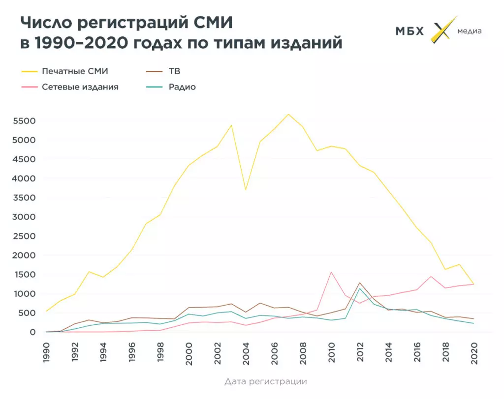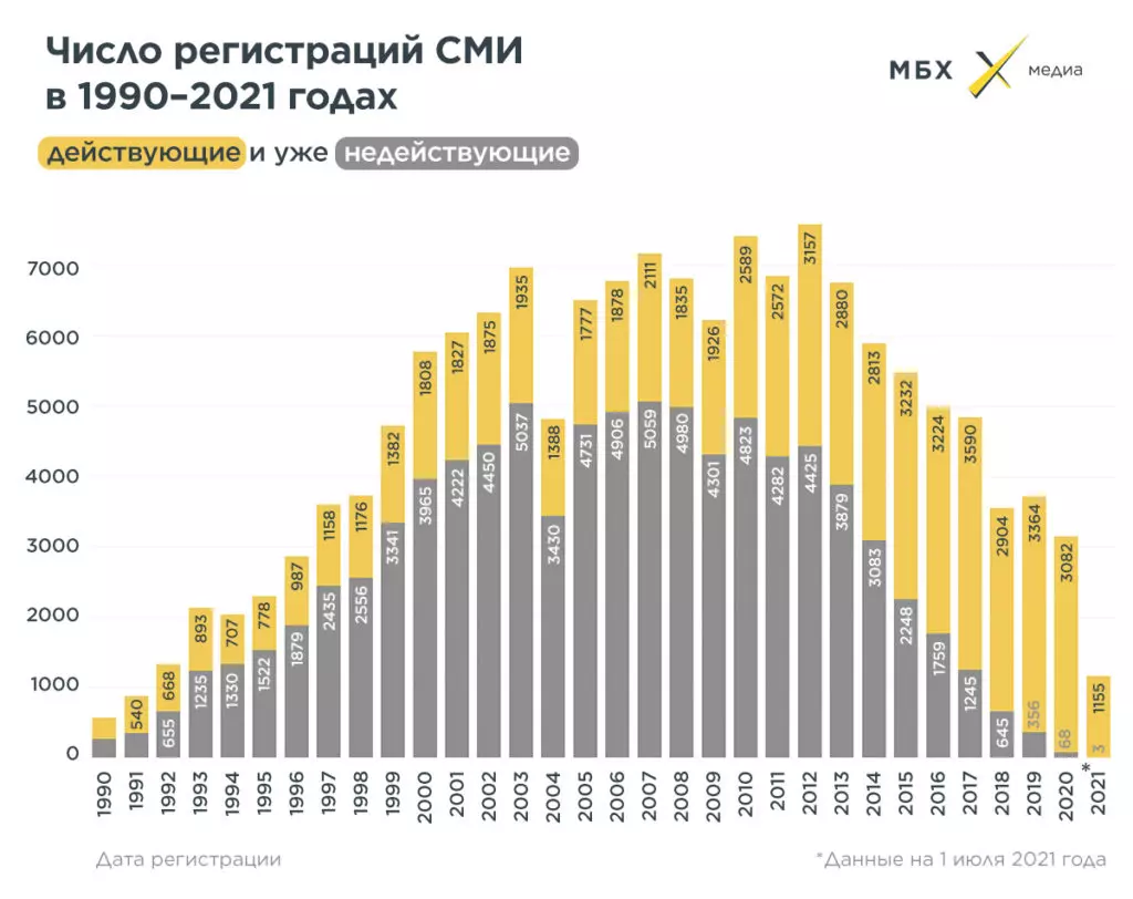 Из-за всего этого в начале десятых годов в России регистрировались тысячи новых СМИ. Но потом число выдаваемых лицензий резко упало. В 2018-2020 годах уровень регистрации новых СМИ находился на уровне конца 1990-х — около 3-4 тысяч в год. В 2020 году было зарегистрировано только 3150 СМИ. Это меньше, чем в 1997 году (тогда лицензии получили 3593 медиа). За шесть месяцев 2021 года зарегистрировано 1158 СМИ, если предположить, что к концу года их число удвоится, это будет еще меньше, чем в 2020 году.