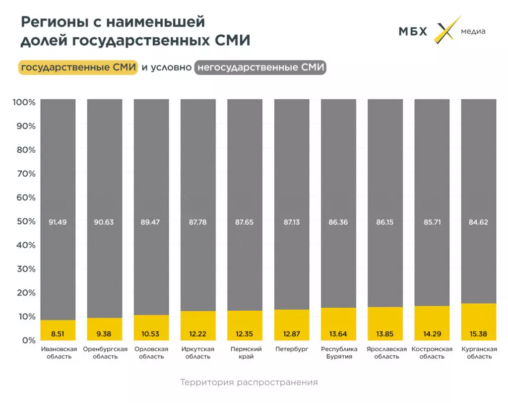 На другом конце не абсолютной, а относительной шкалы — регионы с минимальным присутствием государства в СМИ. Это Ивановская (8,51%), Оренбургская (9,38%) и Орловская области (10,53%). В ТОП-10 самых «негосударственных» регионов, впрочем, есть одна республика — Бурятия с 13,64%.