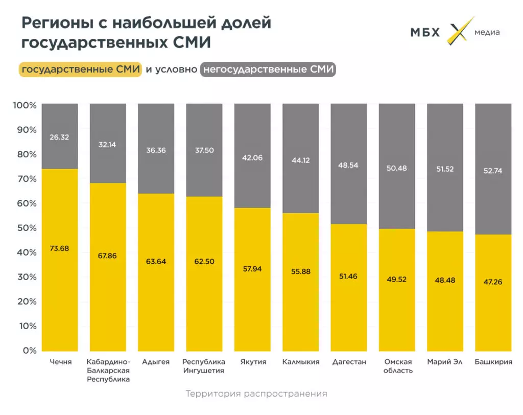 Рекордсменами по «огосударствлению» СМИ довольно предсказуемо являются национальные республики. На первом месте Чечня — из 38 зарегистрированных СМИ 28 (или 73,68%) учреждены административными структурами. На втором — Кабардино-Балкария (67,86%), на третьем — Адыгея (63,64%). В ТОП-10 регионов, в которых доля государственных СМИ выше всего, попала только одна область — Омская, в ней СМИ, учрежденных госструктурами, почти половина от общего количества (49,52%).
