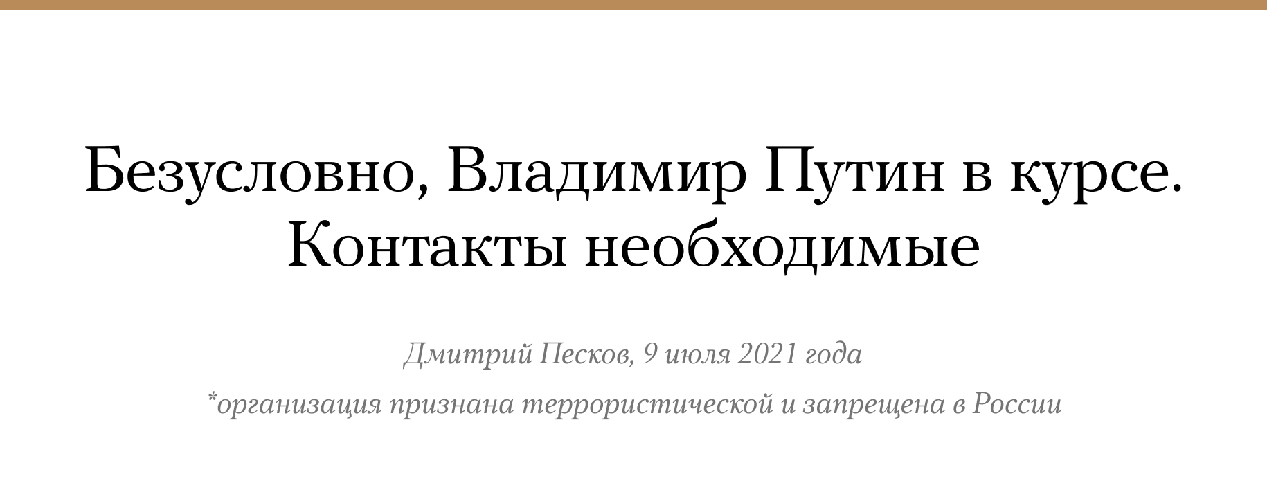 Пресс-секретарь президента РФ Дмитрий Песков назвал необходимыми переговоры, которые Россия ведет с «Талибаном» на фоне ситуации на границе Афганистана и Таджикистана. Делегация террористической организации прибыла в Москву накануне. Вместе с тем на брифинге для прессы Песков отказался отвечать на вопрос, признает ли Россия талибов в качестве правительства Афганистана, если они займут всю страну. «Здесь вряд ли уместны какие-то эвентуальные рассуждения», — заявил представитель Кремля. После вывода американских войск из Афганистана талибы начали очередное наступление в стране, что уже привело к напряженности в приграничных районах с Таджикистаном.