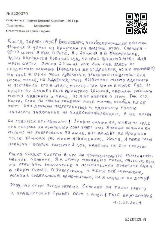 «Меня осудят, скорее всего, на принудительное психиатрическое лечение. Я к этому морально готов, рассчитываю, что отбывать заключение в психической больнице буду в своём городе. В Хабаровске у меня всё нормально, условия содержания приемлемые, но я скучаю по дому!» — написал Надеин.