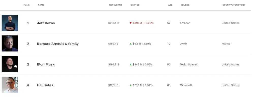 По данным рейтинга Forbes Real-Time, который отслеживает изменения о состояниях миллиардеров в режиме реального времени, состояние Безоса оценивается в 212,4 млрд долларов — он находится на первом месте в списке боагтейших людей мира и единственный имеет состояние более чем в 200 млрд долларов.