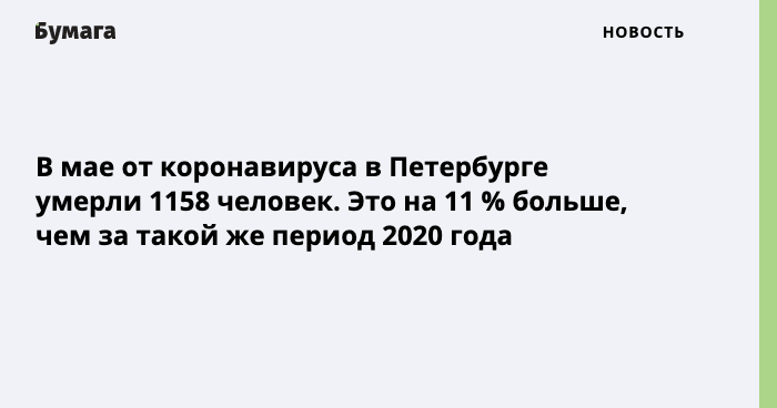 Всего в Петербурге в мае 2021-го умерли 5785 человек — коронавирус стал причиной смерти примерно в 20 % случаев. По сравнению с 2020 годом смертность в Петербурге сократилась на 18 %.
