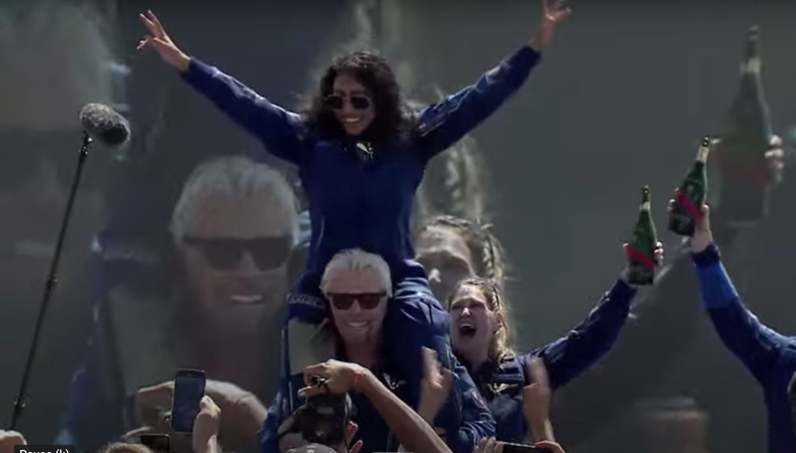 Члены экипажа уходят со сцены. На плечах у Брэнсона сидит Сириша Бандла — вице-президент по связям с правительством, а теперь еще и астронавт.