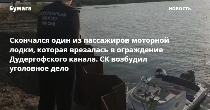 Скончался один из пассажиров моторной лодки, которая врезалась в ограждение Дудергофского канала. СК возбудил уголовное дело