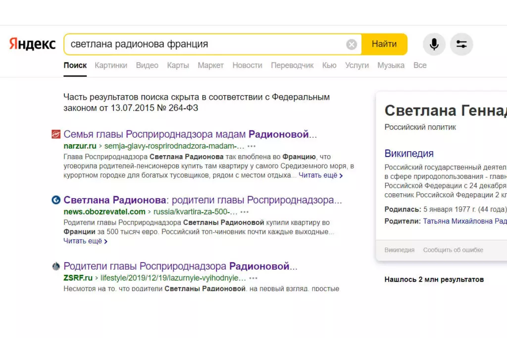 Так, при вводе в поисковике «Яндекса» запросов «Светлана Радионова», «Светлана Радионова Франция», «Светлана Радионова Ницца» на странице выдачи появляется сообщение, что «часть результатов поиска скрыта в соответствии с Федеральным законом от 13.07.2015 № 264-ФЗ». Какие именно ссылки были удалены из выдачи – неизвестно, «Яндекс» не раскрывает эту информацию.