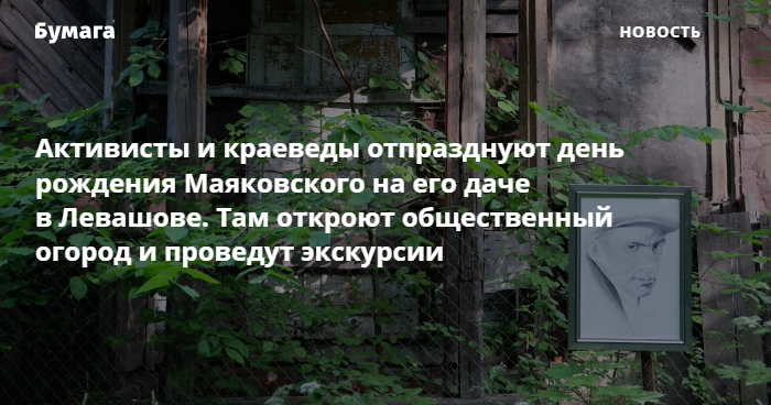 Активисты и краеведы отпразднуют день рождения Маяковского на его даче в Левашове. Там откроют общественный огород и проведут экскурсии