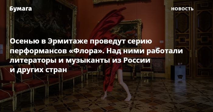 В сентябре в Эрмитаже запустят проект «Флора» — серию вечеров-мистерий, говорится на сайте музея. Эти перформансы будут основаны на сочетании изобразительного искусства, литературы, музыки, танца и актерского мастерства.