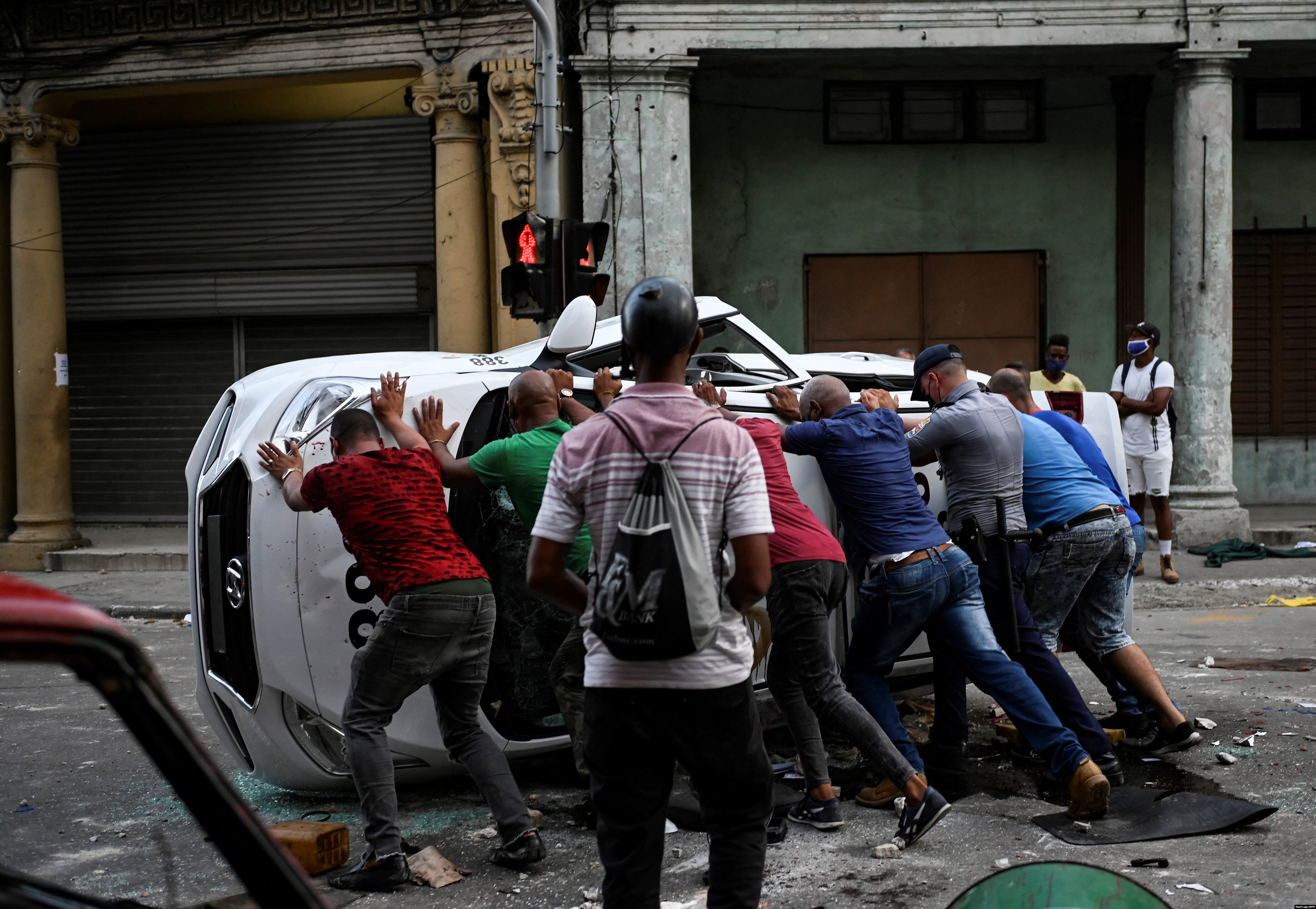 В другом районе Гаваны манифестанты сорвали свой гнев на пустой полицейской машине, перевернув ее, а затем забросав камнями. Многие говорят, что вышли на улицы, узнав о происходящем из соцсетей – что совершенно новое явление для государства, где мобильный интернет вообще впервые стал развиваться менее двух с половиной лет назад. К тому же 11 июля, по многим свидетельствам, он на Кубе вообще еле работал.