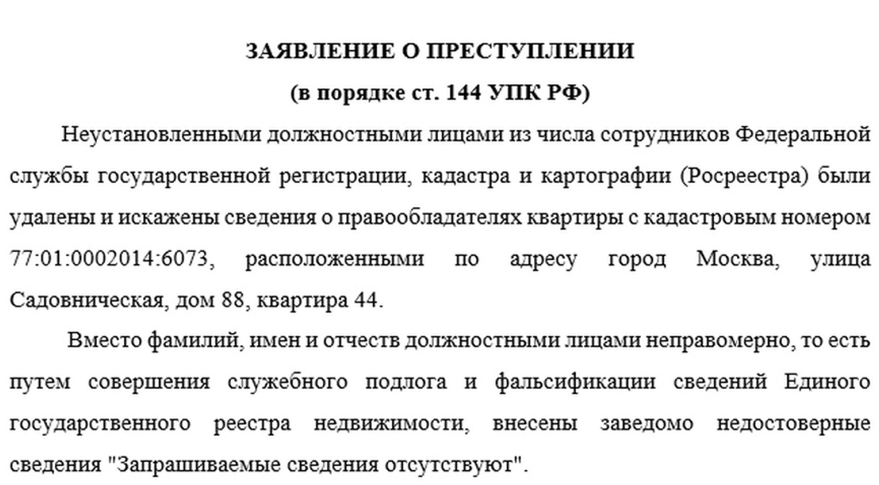 Третье заявление о фальсификации Росреестра, откуда удалили сведения о владельце этой квартиры — вместо данных владельца в реестре указано «Запрашиваемые сведения отсутствуют».