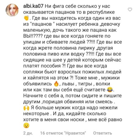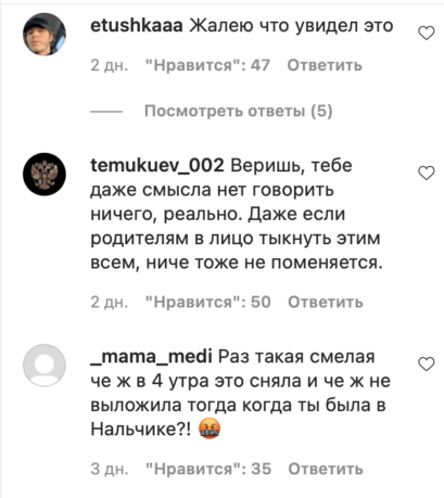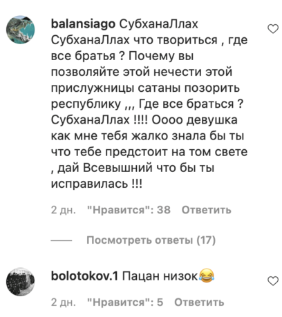 За три дня под постом в инстаграме собралось больше двух тысяч комментариев, в том числе и с угрозами. Некоторые заявили, что девушка «перешла грань».