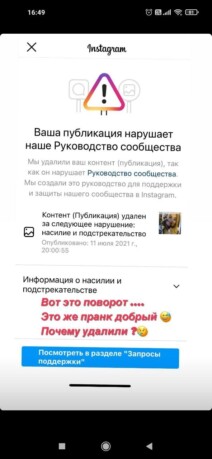 Instagram удалил публикацию за нарушение правил сообщества, объяснив это «информацией о насилии и подстрекательстве». Представители кофейни удивились реакции модераторов и назвали свой призыв «добрым пранком». После этого владелец кофейни перезалил ролик на личную страницу.