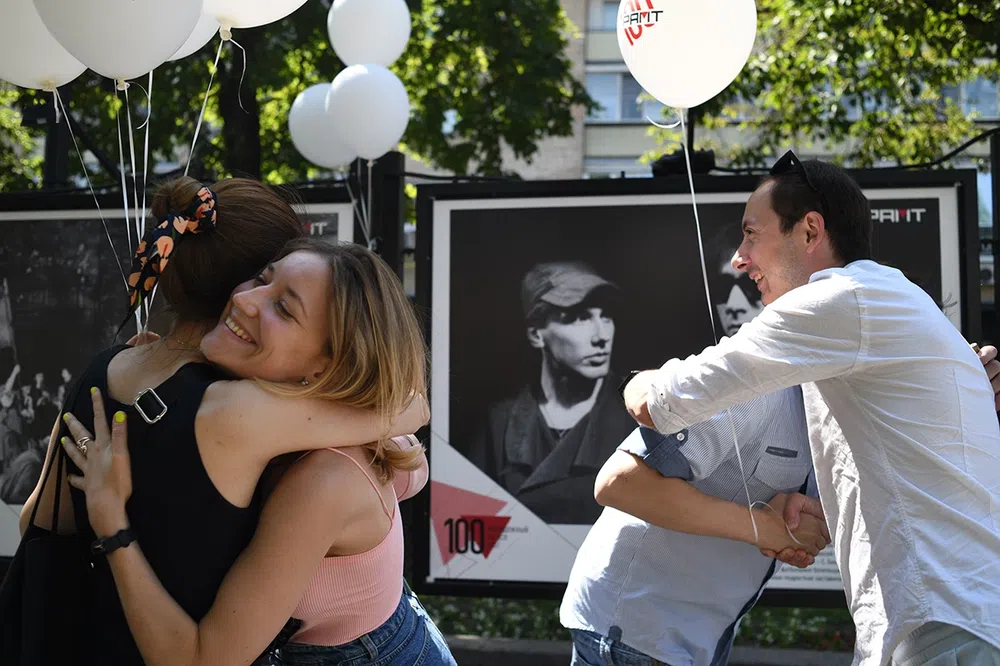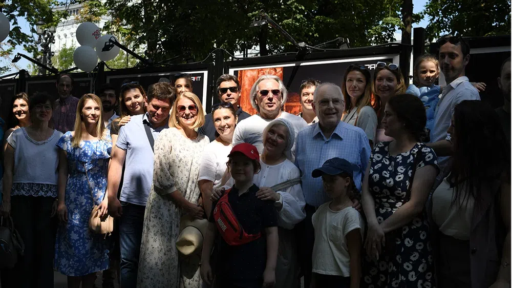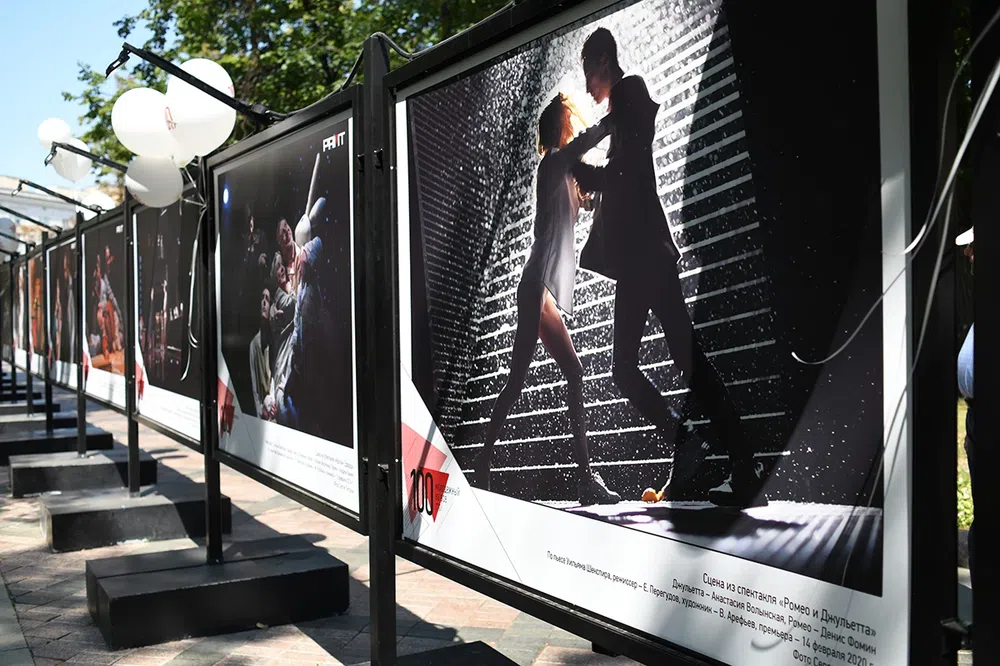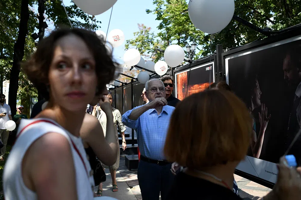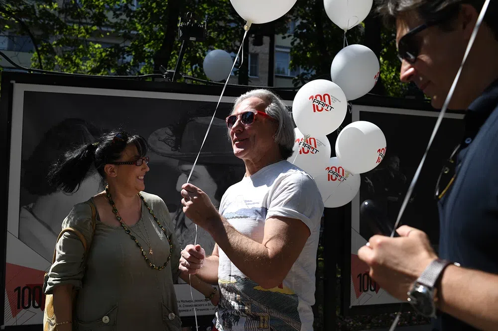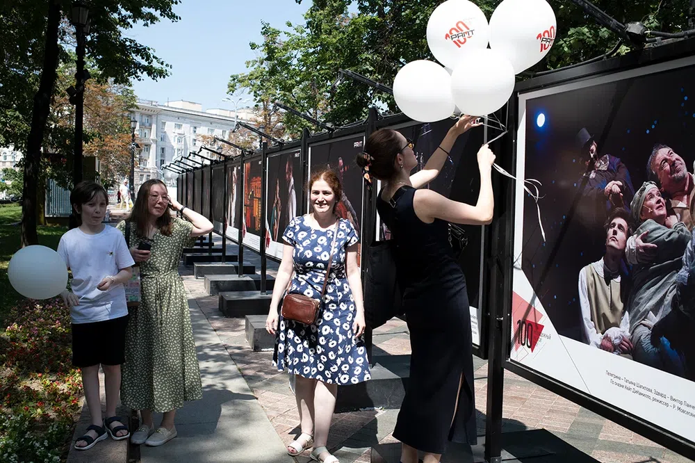 В день рождения театра рамтовцы — актеры и Алексей Бородин, художественный руководитель — гуляли со зрителями по Никитскому бульвару: здесь открыли выставку об истории РАМТа.