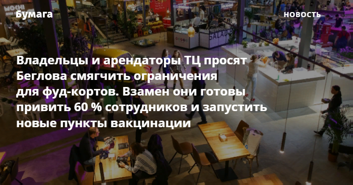 Авторы обращения также попросили разрешить работу общепита в ТЦ навынос и открыть островки. На фуд-кортах они предлагают ввести неполную посадку — от 30 до 50 % мест. Взамен ТЦ обещают допускать к работе с посетителями только привитых сотрудников и запустить дополнительные пункты вакцинации. Подписавшиеся готовы привить не менее 60 % работников.
