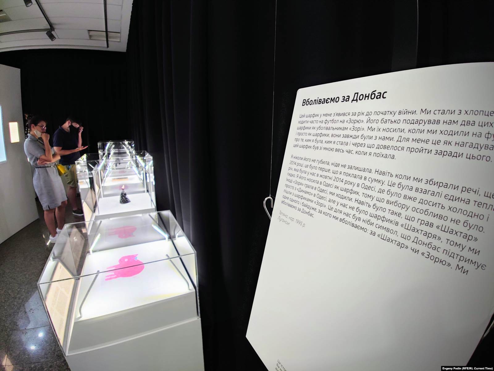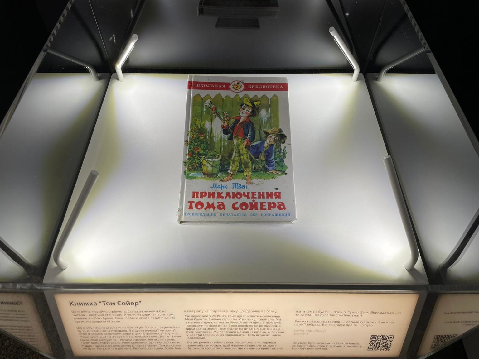 Три коротких строчки под "Любимой книжкой малышей" полностью меняют отношение к предмету. На этой необычной выставке главное – именно подписи, а не экспонаты. Без историй сложно понять, почему в одном зале соседствуют "Приключения Тома Сойера" и колода карт, статуэтка медвежат и шарф фаната луганского футбольного клуба "Заря".