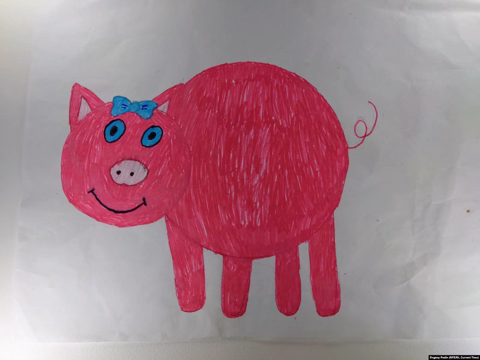 Организаторы экспозиции не выставляли ограничений, какие предметы принимают в музей. Поэтому здесь есть мягкие игрушки, одеяло, билеты, гильзы, книги. Есть фото или зарисовки. Лена подводит к рисунку: с картинки улыбается розовая свинка Нюша с белым пятачком и голубым бантиком на голове.