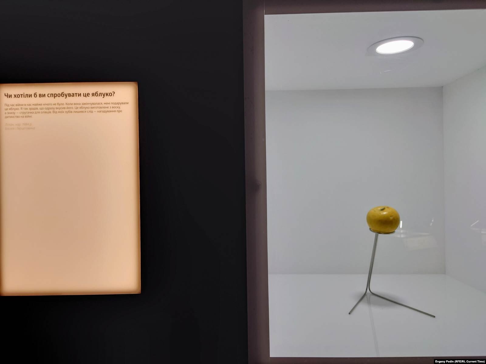 Всего на выставке экспонируется 33 предмета, которые передали дети Донбасса. Историй волонтеры музея собрали более 130. Четыре экспоната – из музея в Сараево: это вещи, принадлежавшие детям из Боснии, Ирака, Сирии, Афганистана. Один из предметов – яблоко со следами зубов. Лилиан, которому в конце боснийской войны было 11 лет, рассказал: в годы конфликта в его семье всегда не хватало еды. Когда ему подарили яблоко, он очень обрадовался и тут же решил откусить кусок. Но фрукт оказался восковым.