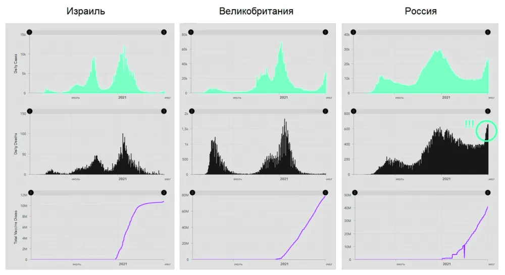 В Израиле выросла заболеваемость с десятков случаев в день аж до 200–300 — всё еще на порядок меньше, чем в одной Москве, то есть и передача вируса подавлена. Ежедневное число смертей при этом вообще не растет. В Великобритании наблюдается довольно резкий рост новых случаев, но смертей больше не стало — люди болеют легко. В России ситуация иная: стремительно выросло число новых случаев, а по числу летальных исходов поставлен рекорд».