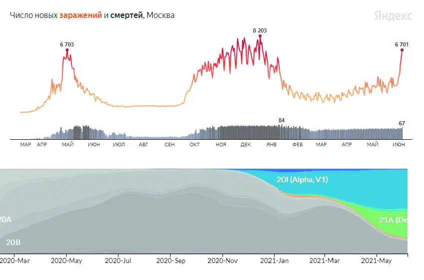 За день до этого, 12 июня, я посмотрела на Nextstrain, как растет частота штамма «дельта» среди штаммов, отсеквенированных в России. Геномов «наших» коронавирусов в базе GISAID относительно мало, однако тенденция хорошо видна. «Дельта» (обозначен на рисунке зеленым цветом) появился у нас сравнительно недавно, но распространяется стремительно, вытесняя как линии, преобладавшие во время первых двух волн, так и «альфу» («британский» штамм, синий на рисунке). А штамм «дельта» известен тем, что вероятность повторной инфекции и для переболевших, и для вакцинированных возрастает. (По ссылке [1] можно видеть нынешнюю ситуацию: «дельты» стало еще больше). Сверху — знакомая многим, как прогноз погоды, коронавирусная статистика для Москвы. Подъем, который не позволял сомневаться: третья волна здесь. А картинка с Nextstrain объясняла причину. Ждали, ждали — лучшей вакцины, особых распоряжений, у моря погоды — и дождались «дельты» (рис. 1).