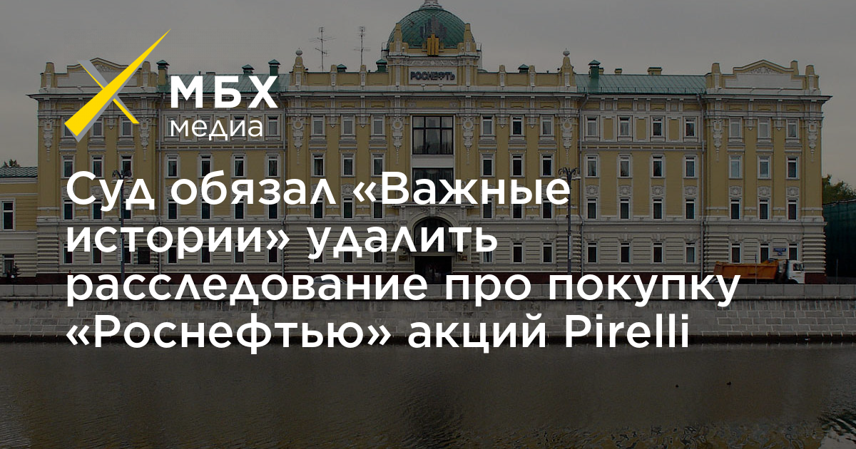 Арбитражный суд Москвы полностью удовлетворил иск государственной компании «Роснефть» и обязал издание «Важные истории» и редактора отдела расследований Романа Шлейнова удалить и опровергнуть материал под названием «Танцовщица для „Роснефти“», посвященный схеме покупки доли в компании Pirelli. Информацию «МБХ медиа» обнаружило в картотеке суда.