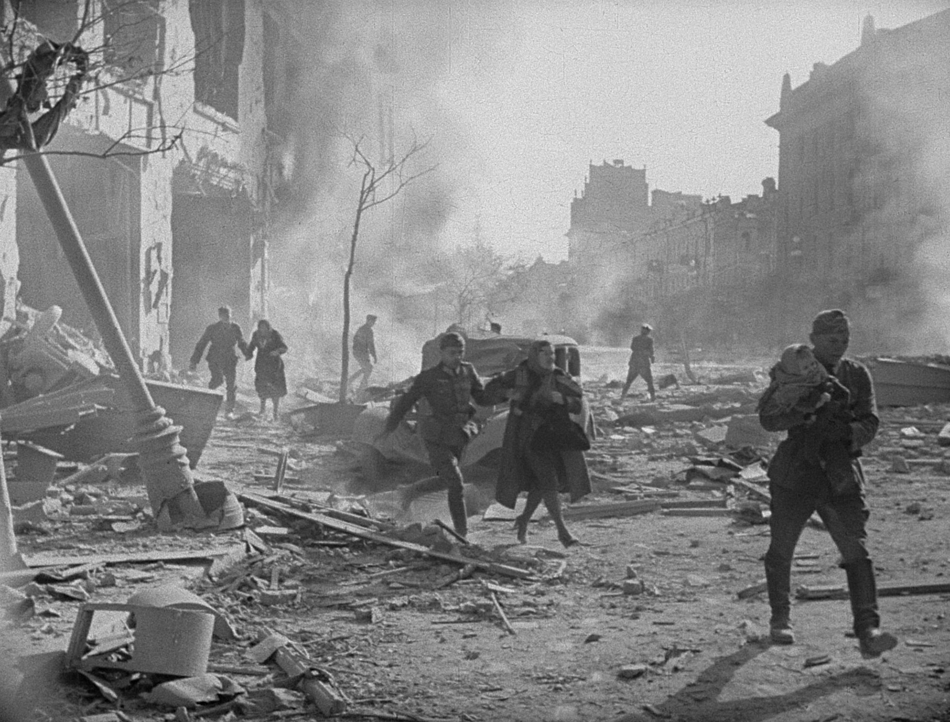 С дистанции мы видим взрывы в центре Киева, подготовленные НКВД перед тем, как немцы захватили город. Вблизи — масштабную встречу оккупантов населением, приветственные плакаты и слоганы, счастливые толпы людей в национальных украинских костюмах и с руками, дружно вздернутыми в нацистском салюте. Наконец, сцены публичных издевательств над обнаженными жертвами, за которыми наблюдает толпа. Вот местное население деловито и споро копает рвы в Бабьем Яру…