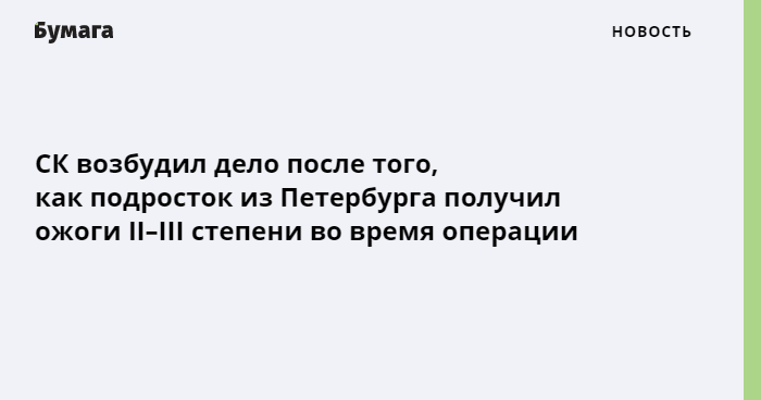По данным следствия, 6 июля подростку делали плановую операцию в одном из медучреждений Петербурга. В результате он получил ожоги II–III степени в области шеи, верхней трети груди, правого плеча и правового и левого надплечья. После этого пострадавшего поместили в ожоговое отделение.