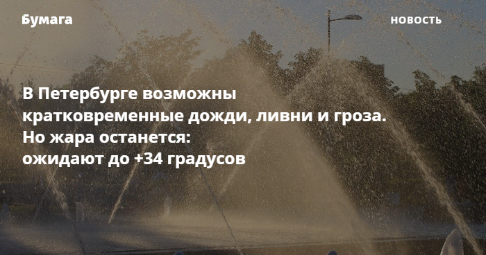 В последующие дни в Петербурге станет чуть прохладнее. В четверг ожидают до +33 градусов, а в пятницу — до +30. Во второй половине этих дней также возможны кратковременные дожди и грозы. Температура воздуха в городе опустится ниже +30 градусов лишь в субботу.