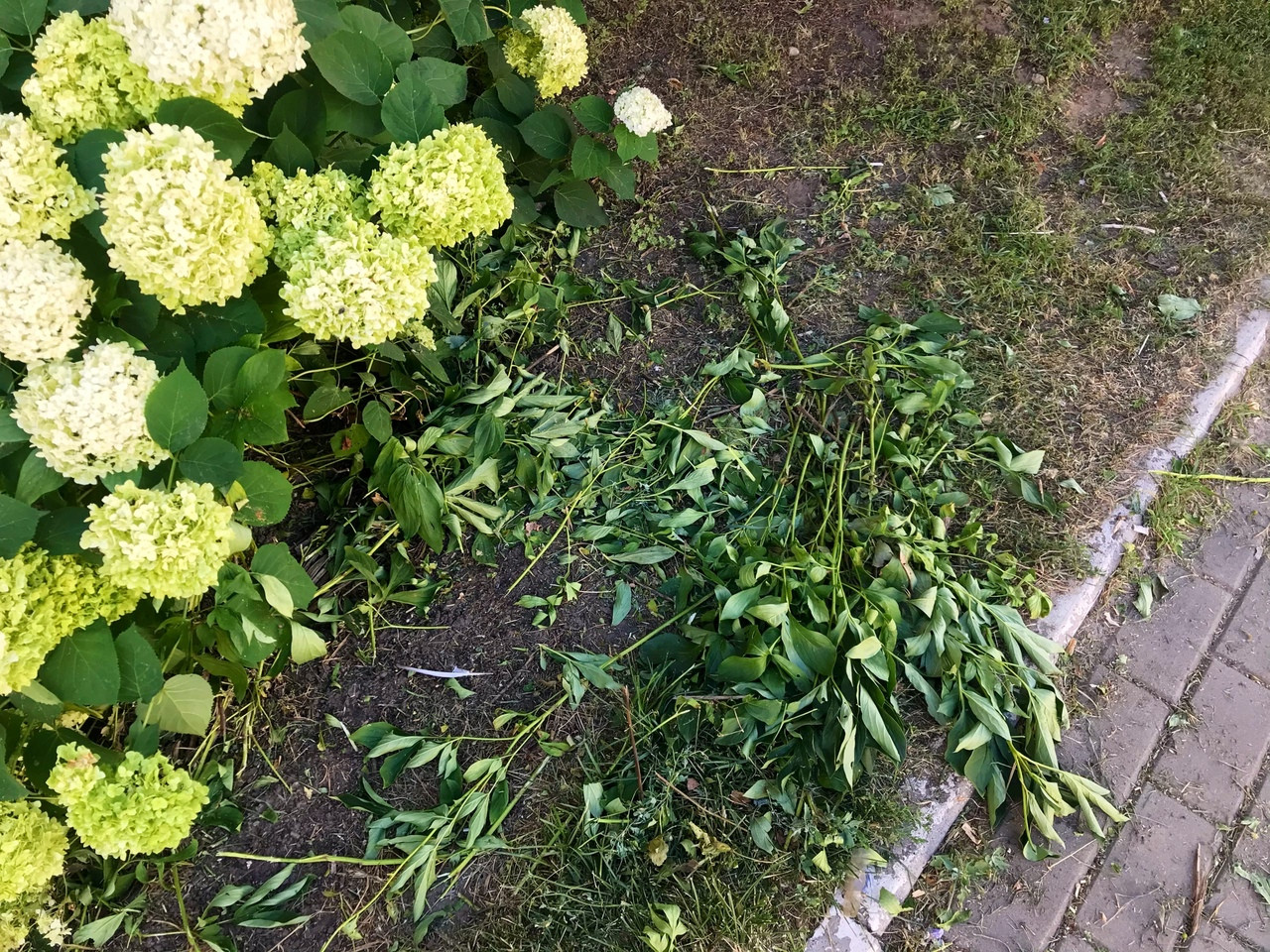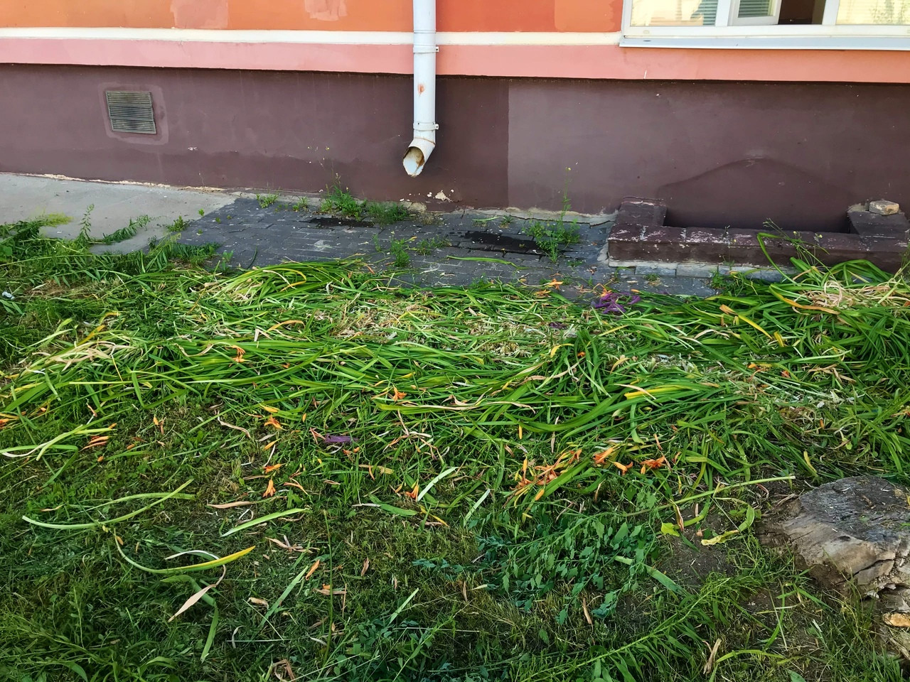 Дом по улице Горького, на клумбе росли цветы, кому пришло в голову их скосить, зачем?