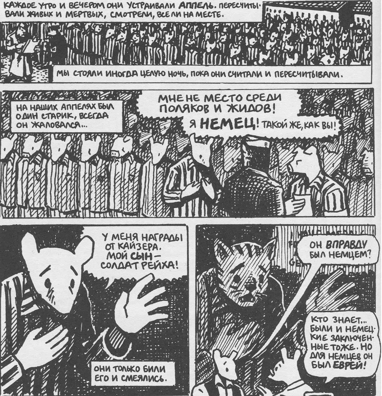 Мыши живут в Восточной Европе, влюбляются, женятся, ездят на велосипедах и поездах, строят бизнес — кто маленький, а кто побольше. Потом приходят коты в строгой униформе со своими жестокими законами. Мышей ждет бегство за границу, тайники в подвалах, колючая проволока концентрационных лагерей, расстрелы и газовые камеры — эту историю вы знаете. Она до степени смешения похожа на сотни других, рассказывающих про Холокост. И выделяется именно тем, что она про нарисованных простым карандашом мышей, котов и свиней.