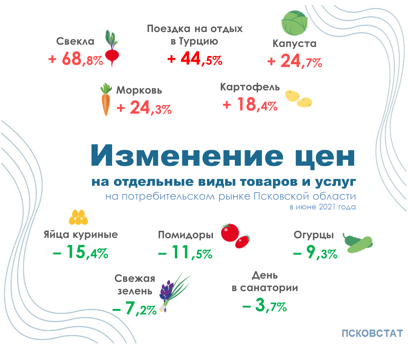 Существеннее всего подешевели из продовольственных товаров за июнь яйца куриные (на 15,4 процента), помидоры (на 11,5 процента), огурцы (на 9,3 процента), зелень (на 7,2 процента), сливки питьевые (на 5,2 процента), масло сливочное (на 4,6 процента), филе рыбное (на 4,2 процента), йогурт (на 4,3 процента), ягоды замороженные (на 3,4 процента), консервы мясные (на 3 процента).