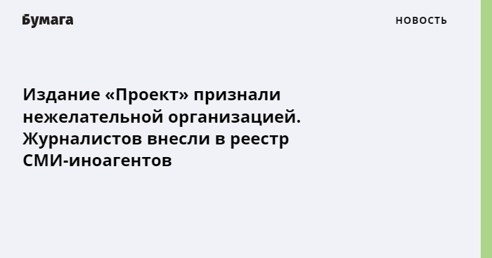 Обновление. Команда «Проекта» сообщила, что признанная нежелательной компания Project Media, Inc., зарегистрированная в США, находится в стадии ликвидации и на данный момент не имеет финансовых отношений с кем-либо из работающих в России журналистов. Коллектив издания намерен продолжить журналистскую деятельность — в какой форме, команда сообщит позднее. «Пока можем сказать главное: расследований меньше не станет», — говорится в заявлении.