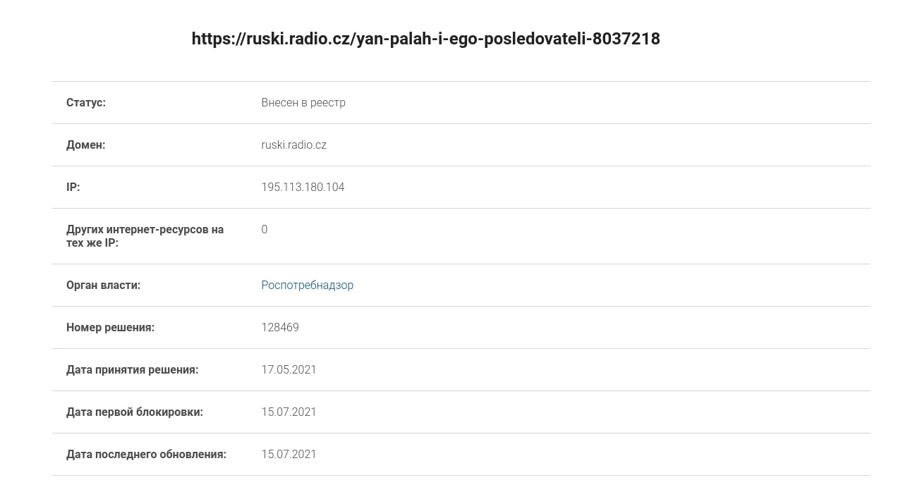 Но на сей раз объектом надзорного внимания стала статья «Ян Палах и его последователи», размещённая 20 лет назад на русскоязычной версии сайта «Радио Прага» накануне 32-летней годовщины акта самосожжения студента Палаха в знак протеста против оккупации Чехословацкой социалистической республики (ЧССР) войсками Советского Союза и других стран Варшавского договора: