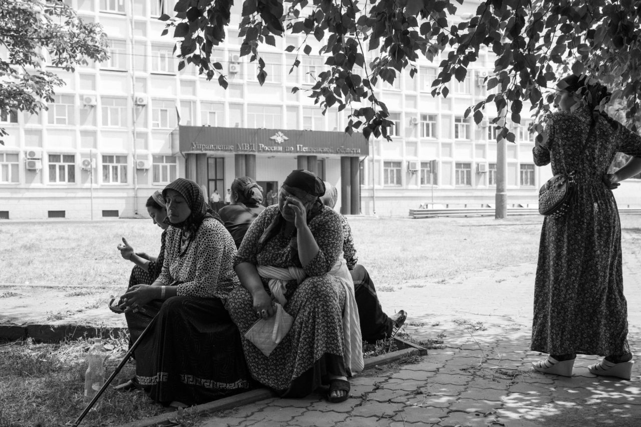 Февраль. До приговора — пять месяцев. Фойе суда пестрит от разномастных юбок и платков. Прежде чем зайти в зал, женщины пьют валерьянку. Спрашивают у других, что лучше купить «от болей в душе». Они заходят в зал заседаний, мужья и сыновья жадно рассматривают родные лица. Кто-то всхлипывает, у кого-то слезы. Потом успокаиваются и даже смеются над тем, как их женщины дают показания. Те плохо говорят по-русски и не понимают вопросов судей, прокурора и адвокатов.