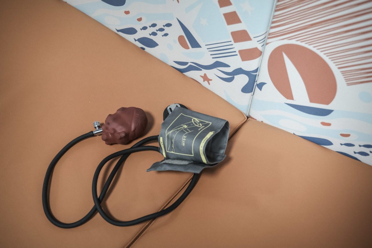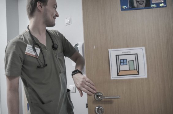 У Александра на пальце татуировка скрипичного ключа, на руке — руны из God of War («Бог войны», компьютерная игра. — Прим. ТД), он в джинсах и кроссовках, сверху зеленая форма. Именно зеленая — белая тут под запретом, по местным каютам никогда в жизни не догадаешься, что ты в больнице, скорее покажется, что в доме отдыха, выдают реальное положение дел только подъемники на потолках.
