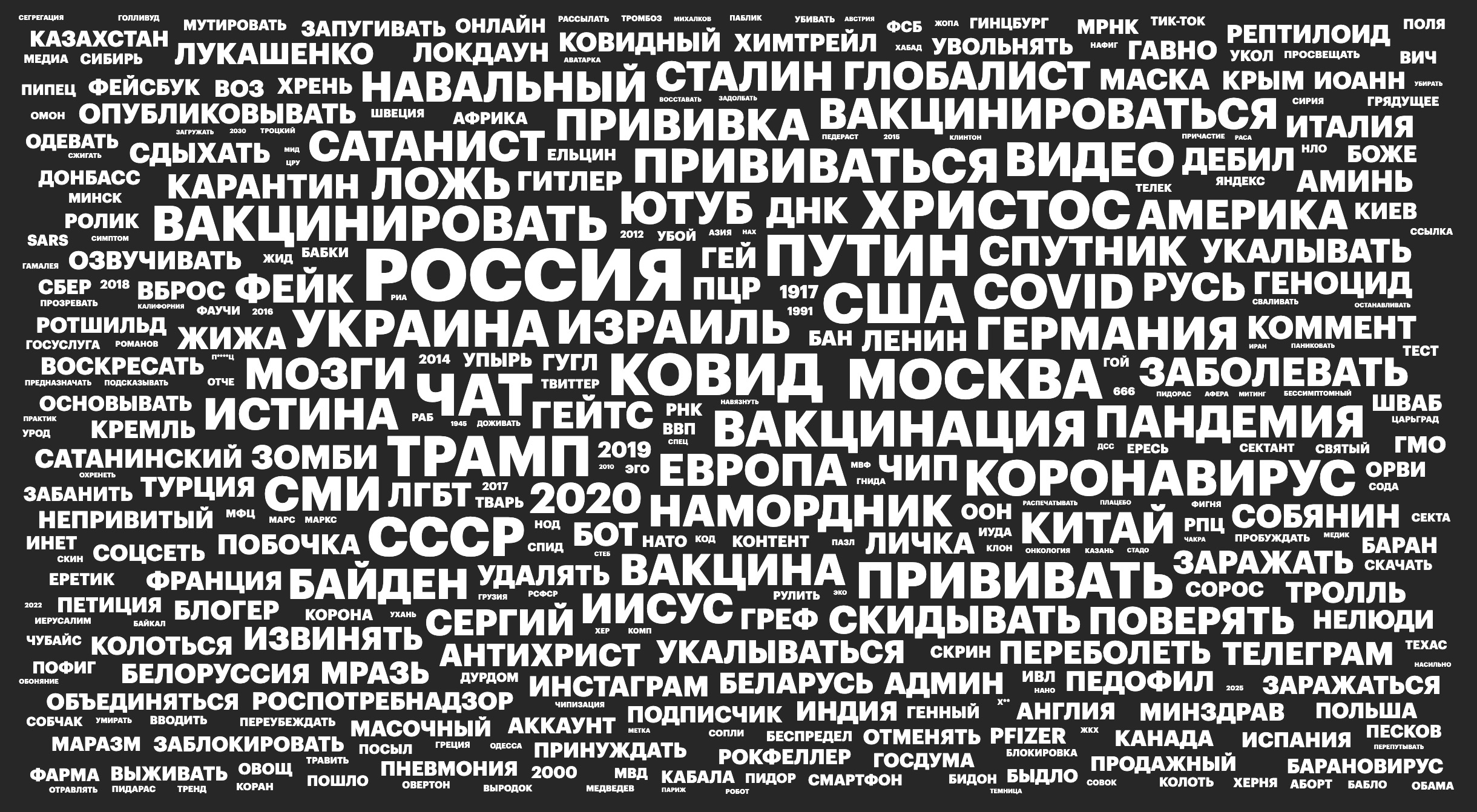 Мы лемматизировали (привели к словарной форме) 3,7 млн сообщений из 54 чатов антивакцинной тематики. Затем мы убрали из результата предлоги, местоимения, имена и некоторые случайные буквосочетания и числа и нормировали результат по Новому частотному словарю русской лексики, чтобы отдать приоритет словам, которые в этих чатах употребляются значительно чаще, чем обычно в русском языке. На картинке — 500 самых характерных для антивакцинных чатов лемм. Чем больше размер шрифта, тем чаще употребляется слово.