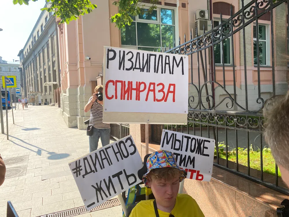 16 июля Даниил Максимов, 19-летний москвич со СМА, и еще несколько взрослых пациентов вышли на пикет перед Министерством здравоохранения РФ. Никто из них не получает необходимых препаратов: Спинразы или Рисдиплама. Даниил Максимов анонсировал пикет в своих соцсетях, поддержать его пришла директор по развитию фонда «Дом с маяком» Лида Мониава: