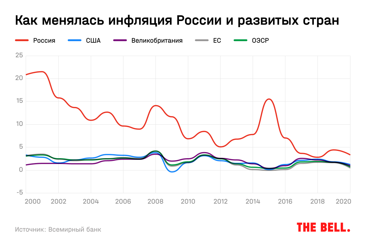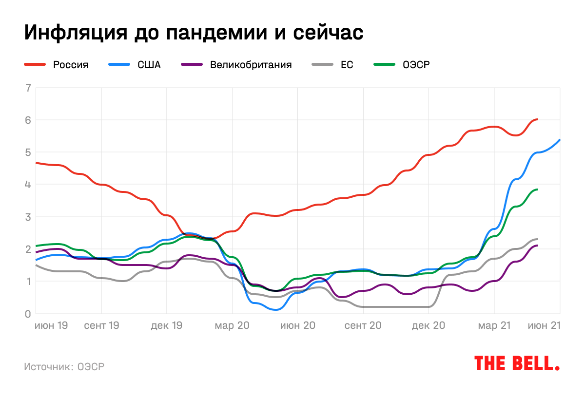 - В среднем в странах ОЭСР (Организация экономического сотрудничества и развития, объединяет 38 развитых стран) инфляция в мае 2021-го выросла до 3,8%, это рекорд с сентября 2008 года. Еще в декабре 2020-го было 1,2%, а в мае 2020-го — 0,7%.