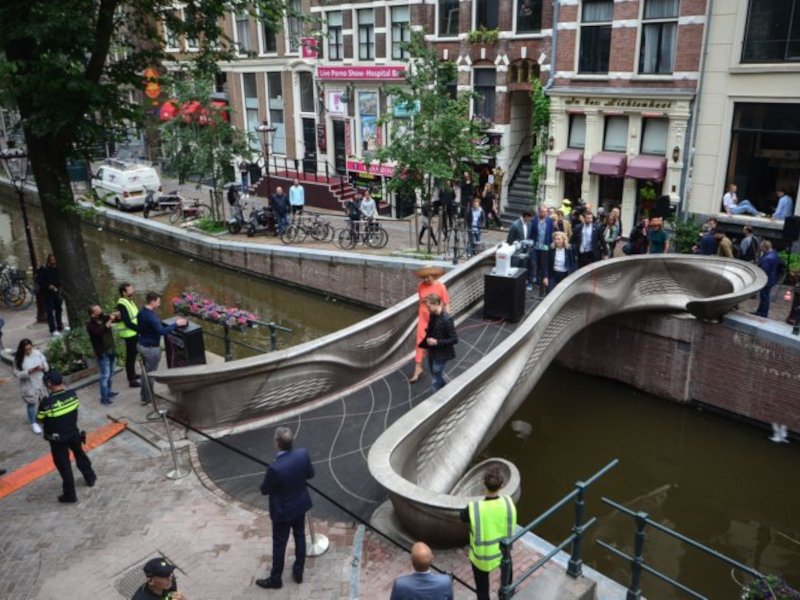 В Амстердаме на канале Аудезейтс Ахтербургвал появился первый в мире стальной мост, который напечатали на 3D-принтере.