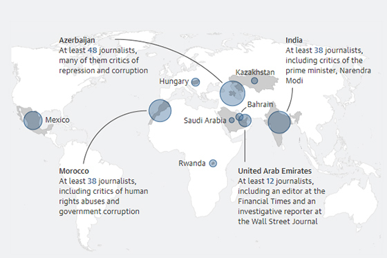 Согласно этим данным, с 2016 года под наблюдением властей были журналисты таких известных СМИ, как The Wall Street Journal, CNN, The New York Times, Al Jazeera, The Financial Times, France 24, Mediapart, El País, Associated Press, Le Monde, Bloomberg, The Economist, Reuters, «Радио Свободная Европа», Франс Пресс и «Голос Америки».
