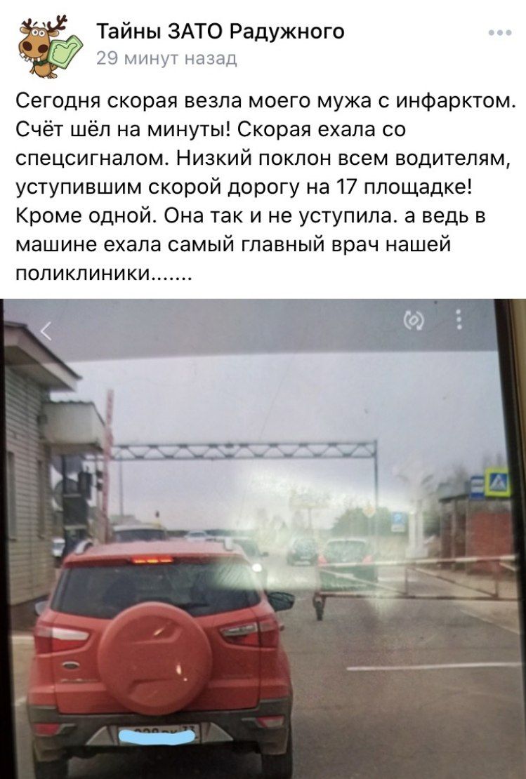— Мне кажется, её действий не одному здравомыслящему человеку не понять. Недавно мы везли с мигалками мужчину в тяжёлом состоянии, у него инфаркт был. Все автомобили пропустили, кроме одного. Это была машина главврача…