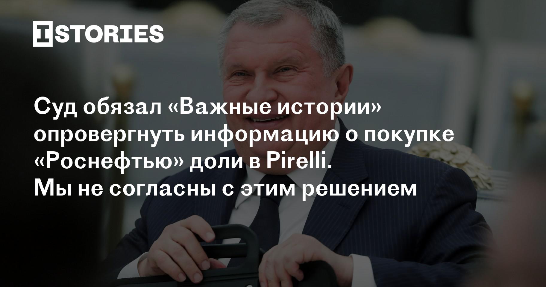 Представители «Роснефти» заявили в суде: госкомпания не покупала долю в Pirelli, а также не контролировала акции итальянского шинного гиганта через каких бы то ни было представителей. 14 июля судья Московского арбитражного суда Максим Ведерников обязал «Важные истории» опубликовать опровержение и удалить информацию.