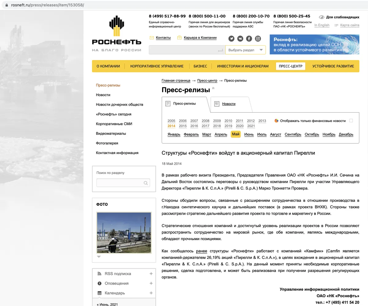 Но в 2021 году представители госкомпании заявили в суде против «Важных историй», что наше расследование создает у читателей «искаженное впечатление», что «Роснефть» приобрела долю в Pirelli, а затем ее утратила.