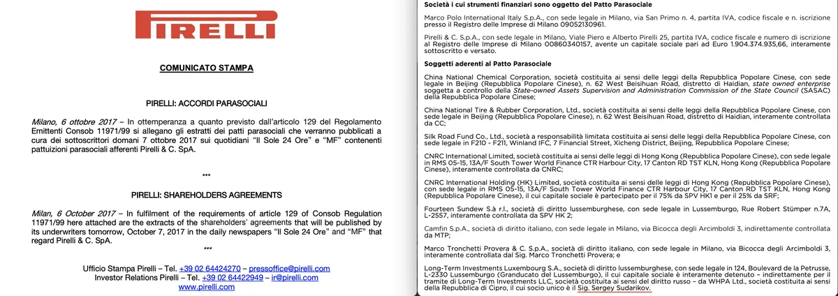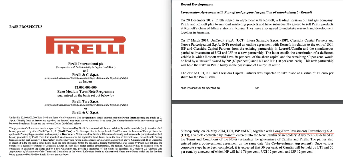Документы на сайте Pirelli показывают, что «Роснефть» изначально вела переговоры о покупке доли в Pirelli, фигурировала в качестве стратегического инвестора в протоколе о намерениях, а затем назначила инвестором люксембургскую компанию, которую «контролировала». После завершения сделки инвестор выдвинул в совет директоров Pirelli топ-менеджеров «Роснефти».